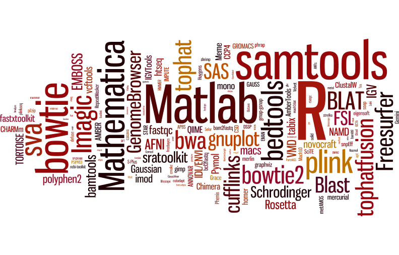 The word cloud below displays scientific applications run on the Biowulf cluster from 2010 - 2015. The word size is in proportion to the number of unique users who have run each app