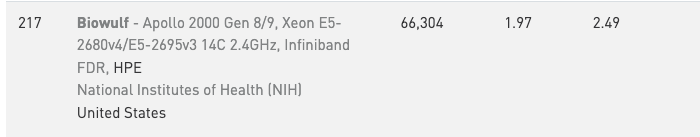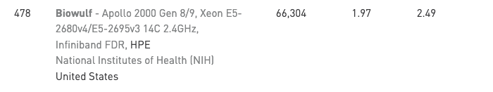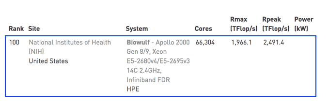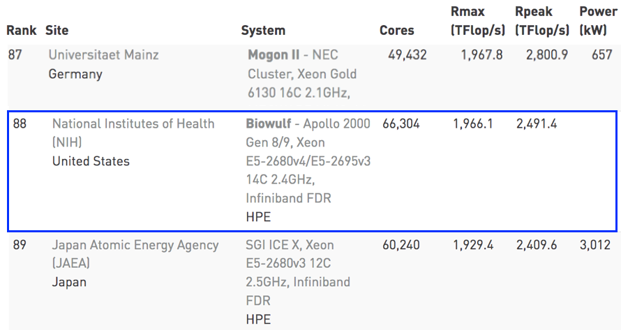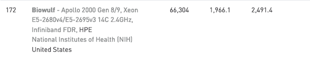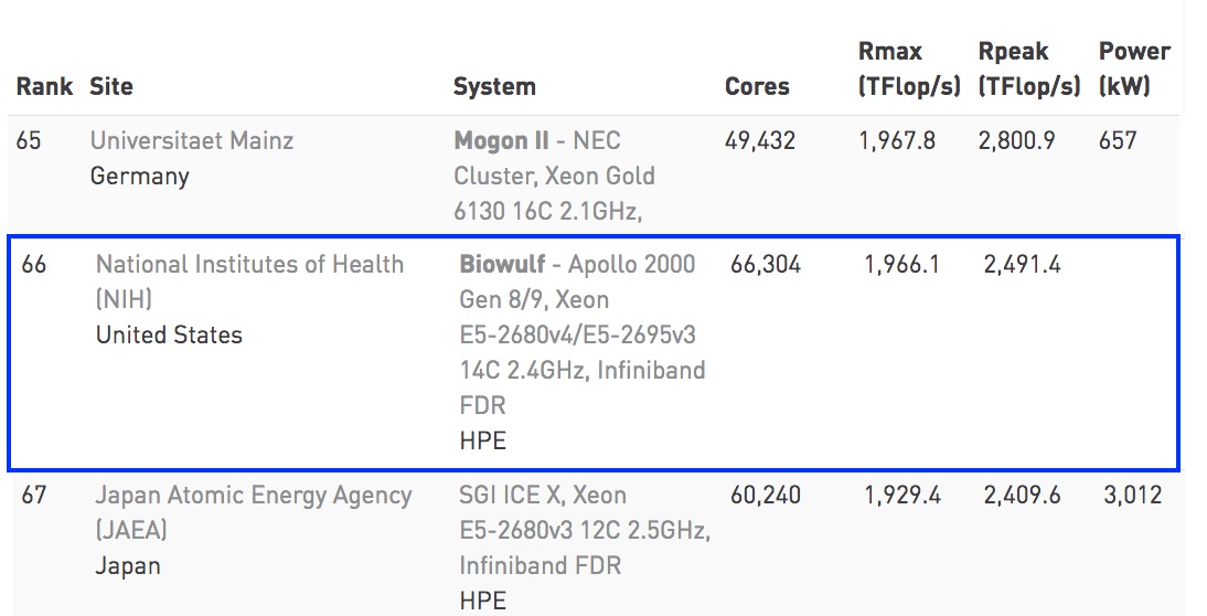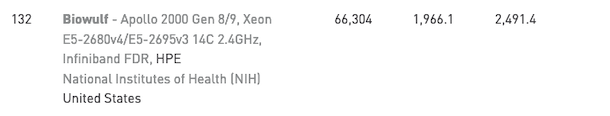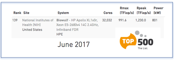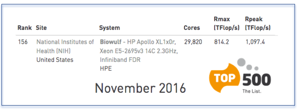 November 2016: Biowulf made its first appearance on the Top500 list. The Linpack benchmark run on Biowulf's Phase 2 nodes put it at position 156.