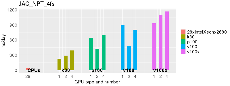 The benchmark above was run on a Intel Xeon E5-2680 v4 @2.5GHz with 28 cores (56 hyperthreaded cores). As with other MD applications, the performance drops when more than 28 MPI processes (i.e. 1 process per physical core) are run. Thus, if running on CPUs, it is important to use the '--ntasks-per-core=1' flag when submitting the job, to ensure that only 1 MPI process is run on each physical core. If it is possible to run on a GPU node, you will get significantly better performance as shown in the benchmarks below.