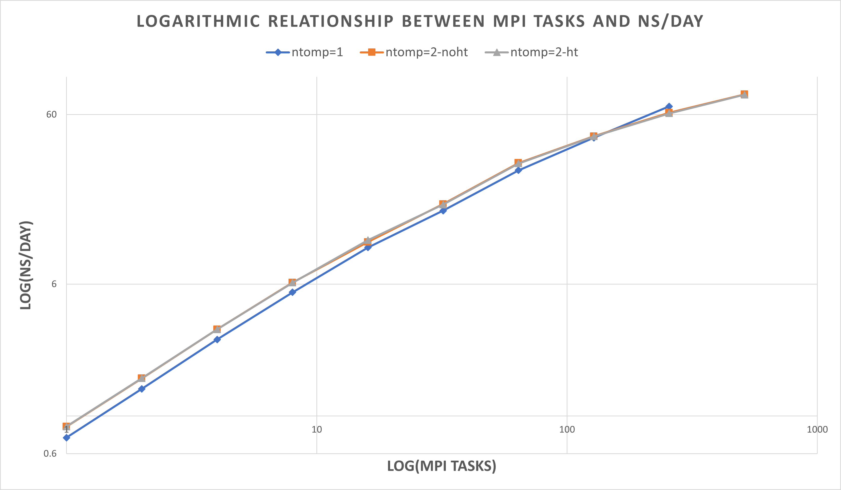 ntomp = 2-ht grey line 2 threads per MPI task, hyperthreading enabled. This effectively uses the same number of cores as ntomp=1, but uses both hyperthreaded CPUs on each core.