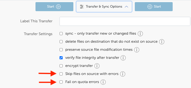 - 'Fail on quota errors' -- if you hit quota on the destination directory, the transfer will exit. Also recommended.